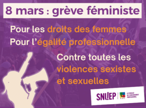 Le 8 mars, dans le cadre d’un appel très large, le SNUEP-FSU et la FSU appellent à une mobilisation massive et à la grève féministe pour l’égalité.